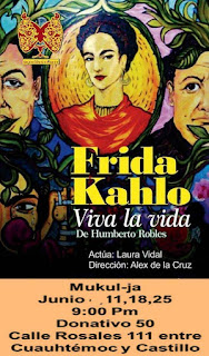 Para quienes aún no lo ven, este jueves a las 9 de la noche se presenta el monologo FRIDA KAHLO - VIVA LA VIDA, lo recaudado será donado para compra de medicamentos de una querida amiga de Mi Vida en el Arte, gracias por colaborar. Donativo: $50